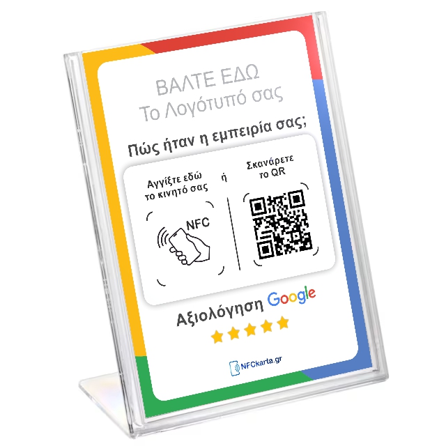Το Σταντ Google Review με NFC & QR από πλεξιγκλάς A6 είναι η πιο πρακτική και καλαίσθητη λύση για να αυξήσετε τις αξιολογήσεις της επιχείρησής σας στο Google, τη στιγμή που ο πελάτης βρίσκεται ήδη στον χώρο σας.