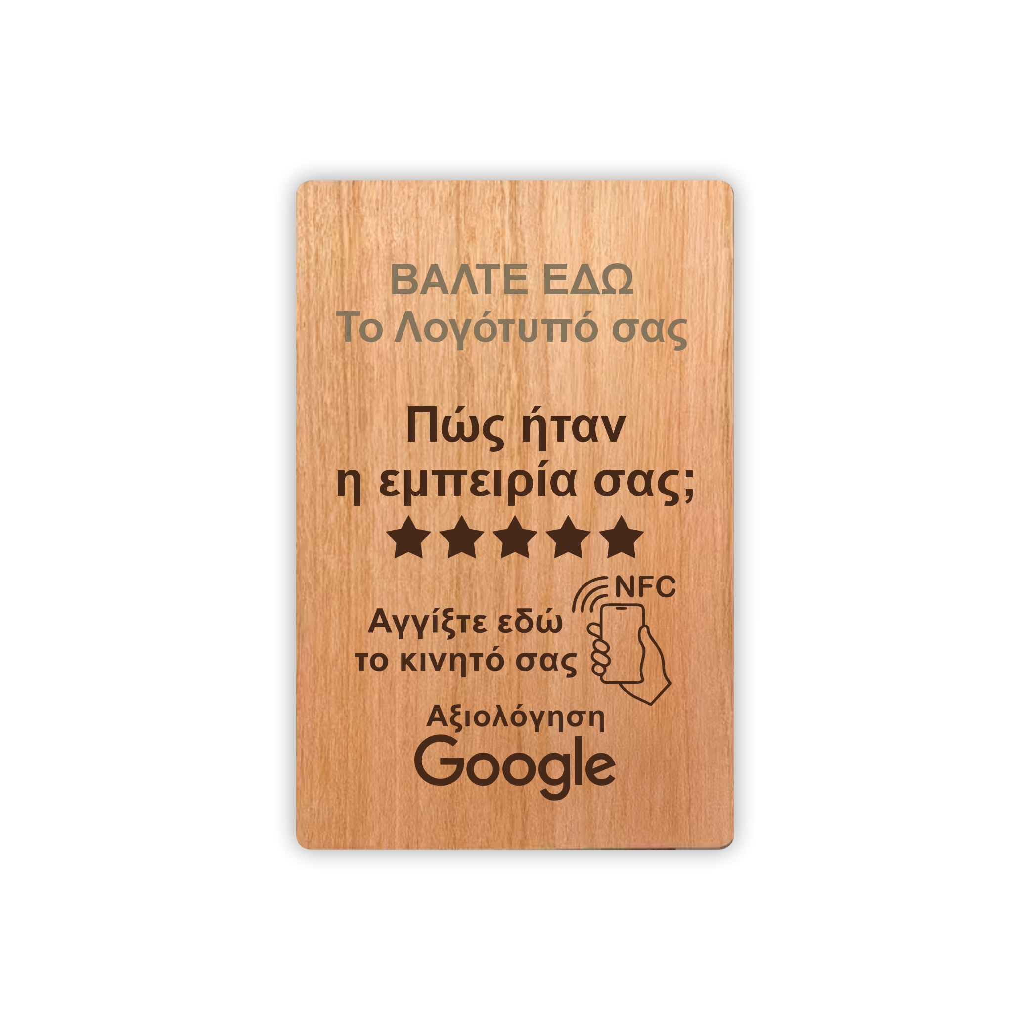 Κατασκευασμένη από φυσικό ξύλο και σε διάσταση κάρτας NFC, είναι ελαφριά, ανθεκτική και εύκολη στη χρήση. Ο πελάτης απλώς αγγίζει το κινητό του επάνω στην κάρτα και μεταφέρεται άμεσα στη σελίδα αξιολόγησης Google, χωρίς εφαρμογές ή οδηγίες.